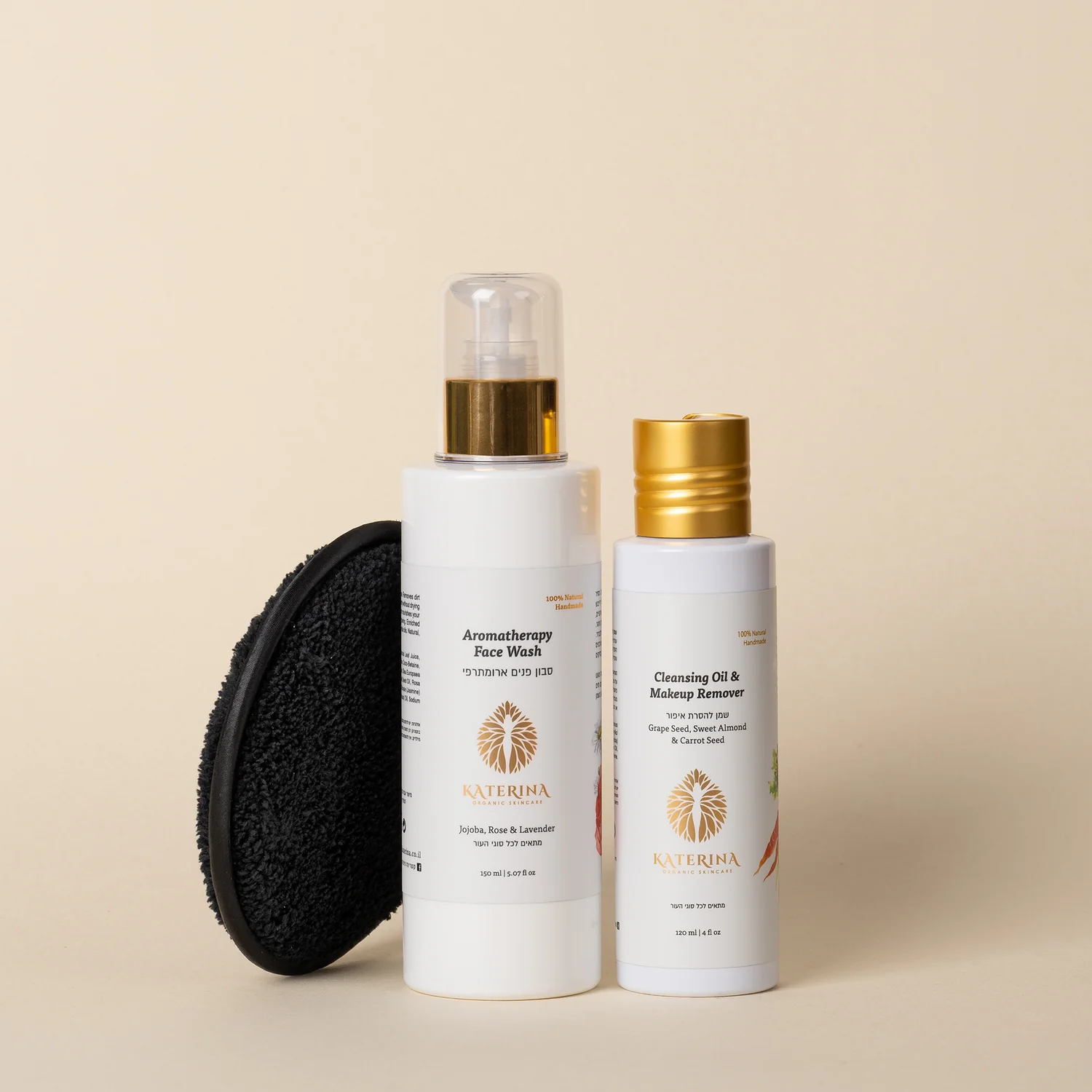 - שמן להסרת איפור+סבון פנים ארומתרפי+כרית מיקרופייבר